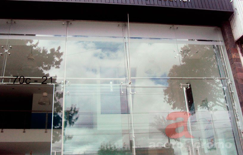 fachada en vidrio templado incoloro con accesorios en acero inoxidable y puerta corrediza